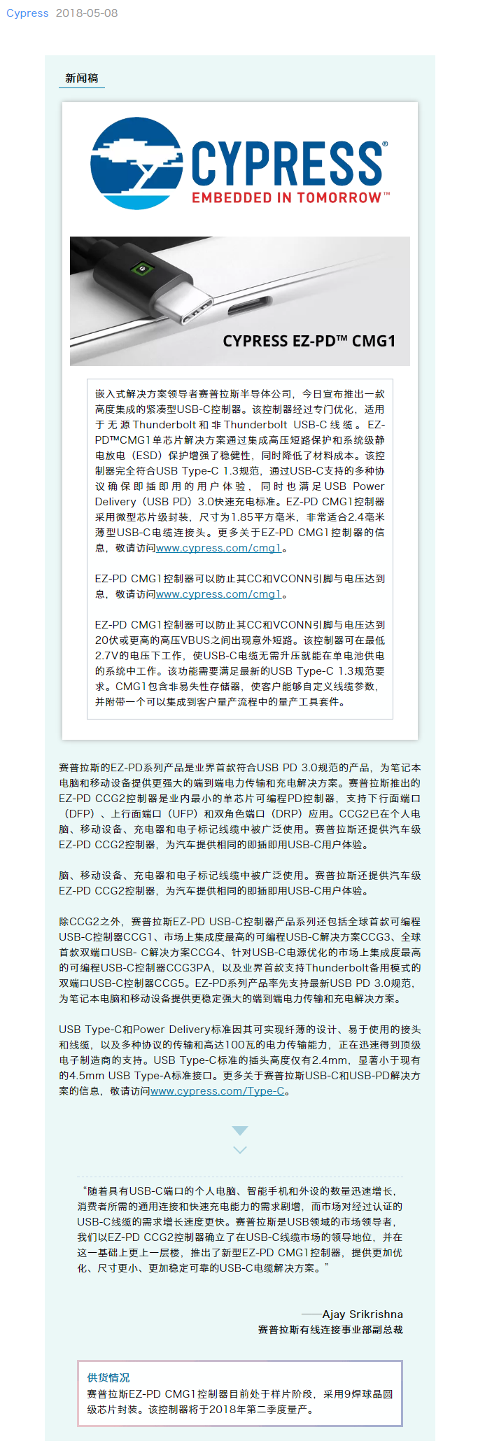| 賽普拉斯推出用于電子標記線纜的新一代USB-C和Power Delivery控制器,擴大在USB領(lǐng)域的領(lǐng)先優(yōu)勢 |