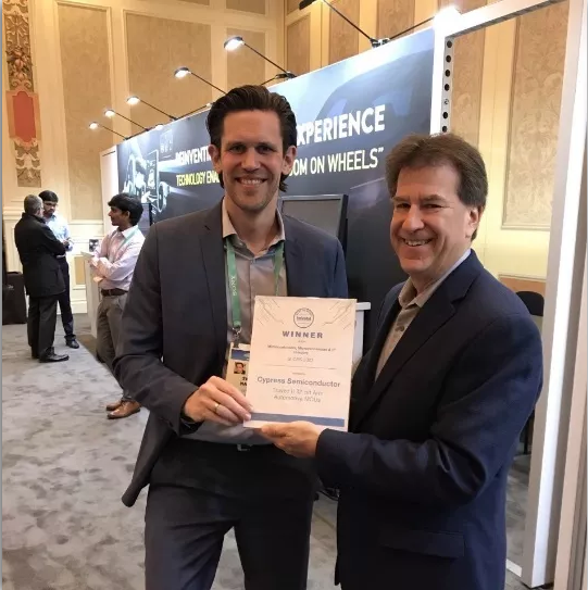 賽普拉斯高級產品營銷總監Sven Natus先生(左)接受Embedded Computing Design 執行副總裁Rich Nass先生(右)的頒獎