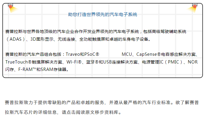 Traveo II 車用MCU系列采用64至176引腳的LQFP封裝,以及272至320引腳的BGA封裝,Flash大小從512KB 至8MB,已經向全球客戶供貨。Continental、Magneti Marelli等全球領先的汽車電子系統供應商均在其產品線中采用了Traveo II。欲了解有關Traveo II MCU的詳細信息,請點擊閱讀原文移步資料庫。