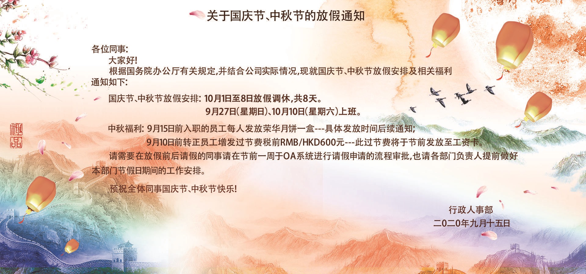 | 關于2020年國慶節、中秋節的放假通知 |