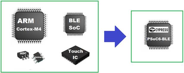 采用Cypress PSoC 6-BLE單芯片架構的IoT產品設計(下圖右側),不僅從產品功能上實現了傳統的三顆芯片以上功能的設計,同時減少芯片器件數目和PCB板的面積從而降低了系統整個的BOM成本,為新的IoT產品設計優化了系統解決方案并極大的降低了產品的功耗。